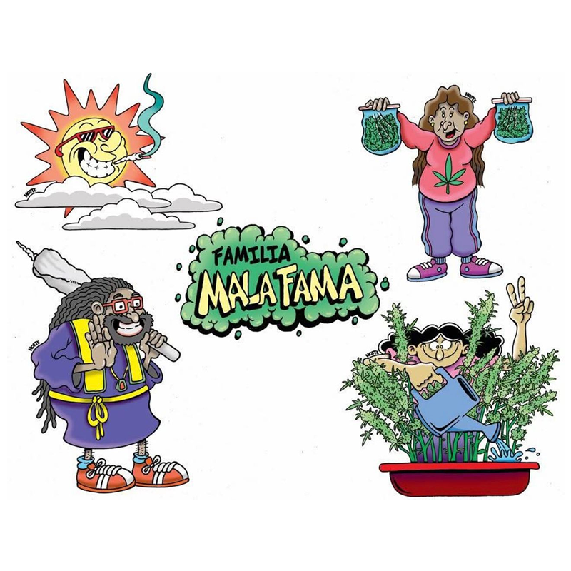 Lleva la vibra urbana y la esencia irreverente de Casa MalaFama a donde quieras con esta colección de stickers holográficos. Cada diseño está inspirado en personajes únicos de la cultura 420 y frases que representan a la Familia, con un acabado brillante que cambia de color según la luz.